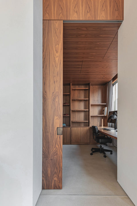 Naudotos medžiagos | Riešuto lukštu faneruotas MDF, metalas, dažytas MDF, compact HPL plokštė, žalvaris.