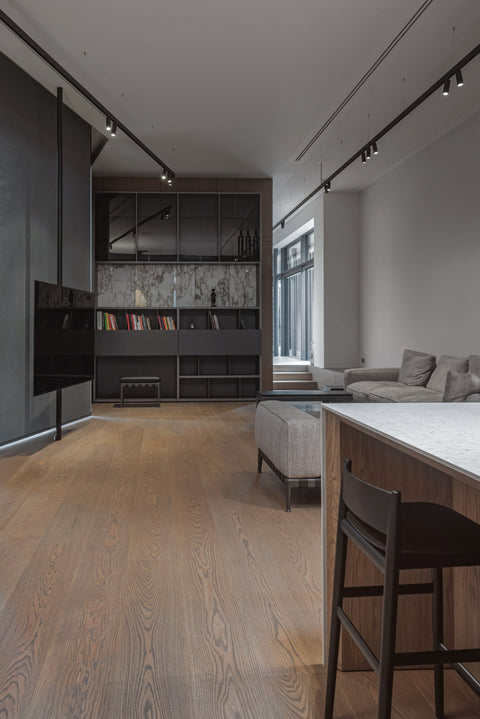 Naudotos medžiagos | Tonuoto ąžuolo lukštu faneruotas MDF, metalas, dažytas MDF, stiklas, veidrodis, nerūdijantis plienas, ąžuolo masyvas.