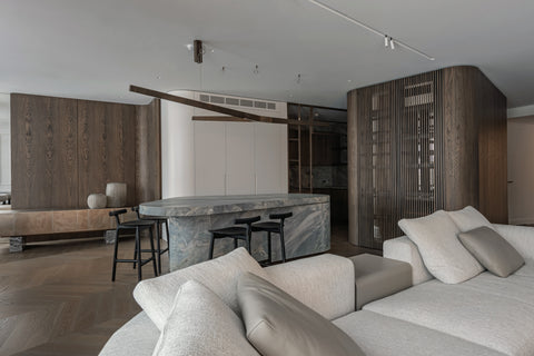 Naudotos medžiagos | Tonuoto ąžuolo lukštu faneruotas MDF, dažytas MDF, stiklas, metalas, nerūdijantis plienas, sendintas žalvaris.