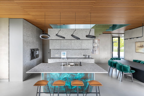 Naudotos medžiagos | Ąžuolo lukštu faneruotas MDF, metalas, dažytas MDF, compact HPL plokštė, žalvaris, akmuo.